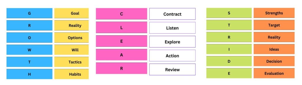 Many people find that working with a coach or mentor is beneficial when it comes to goal setting, and it’s an activity that is commonly incorporated into the coaching process. Working with a coach or mentor can help someone to unpick what their goal is, decide if it’s realistic and identify what actions are needed in order to achieve it. The goal setting process forms a key element in the design and implementation of many coaching models. Some commonly used models are outlined below, although the process and path taken may not be as unidirectional as these models suggest.